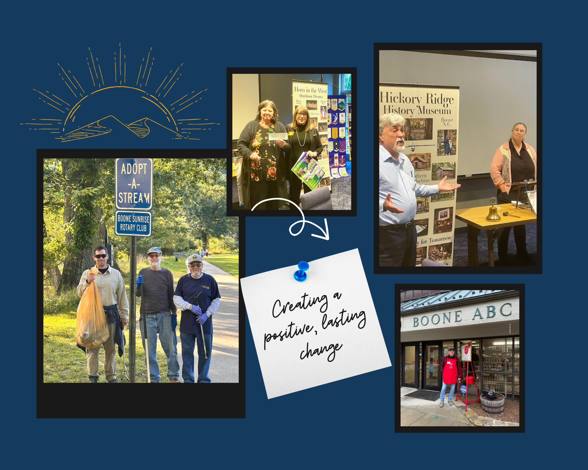 The Boone Sunrise Rotary Club is part of Rotary International, a global network of more than 1.2 million neighbors, friends, leaders, and problem solvers who unite to create lasting change locally and around the world. From supporting initiatives in the High Country to advancing opportunities abroad, Boone Sunrise Rotary brings people together to make a meaningful impact while building strong personal and professional connections.