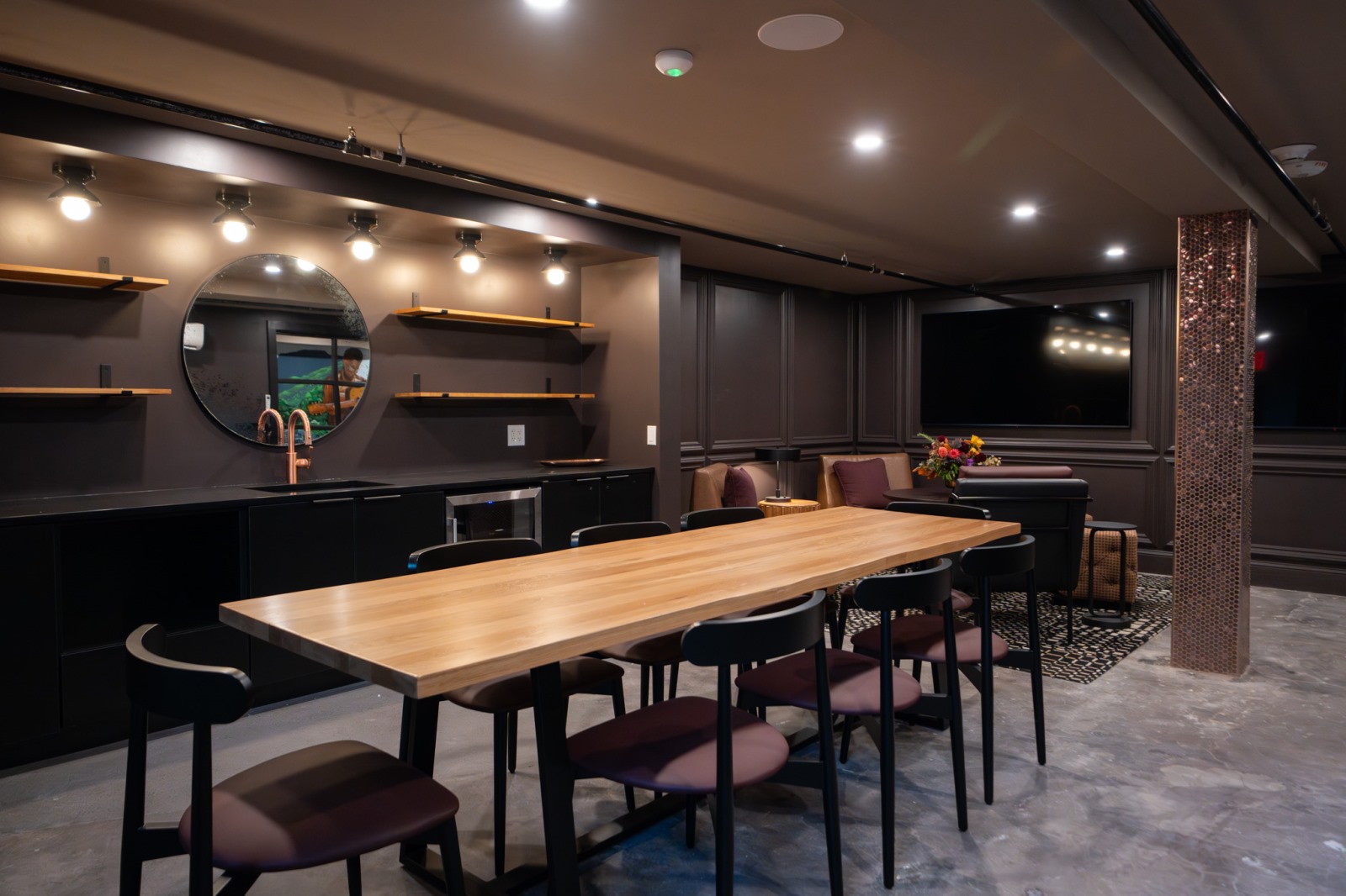 The Foundry adapts seamlessly to guest needs — perfect for business meetings, intimate gatherings, family celebrations, or even tailgate watch parties. Folding doors open into an elegant atrium, creating an indoor–outdoor flow ideal for both productivity and celebration.